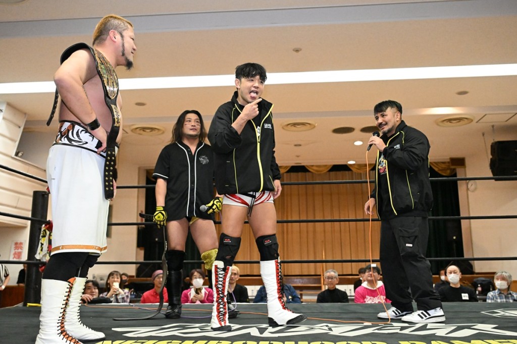 挑戦が決まった今成は「今年何試合か組まれて、勝ったり負けたりだけど、定着してきた感があったので。今日勝てたし、いけそうな気があった。今まで挑戦した人たちは急造のタッグだったから。僕らは急造じゃないから。僕ら4月にシングルで戦いましたけど、そこで終わりにしないで、いい形で年末締められればいい」、冨永は「個人的には2回目のタッグ挑戦。1回目の挑戦のとき、アキレス腱切れちゃって、不完全燃焼だったんで。今成さんと勝って今年を締めくくれたらいい」とベルト獲りに向け気合を入れた。