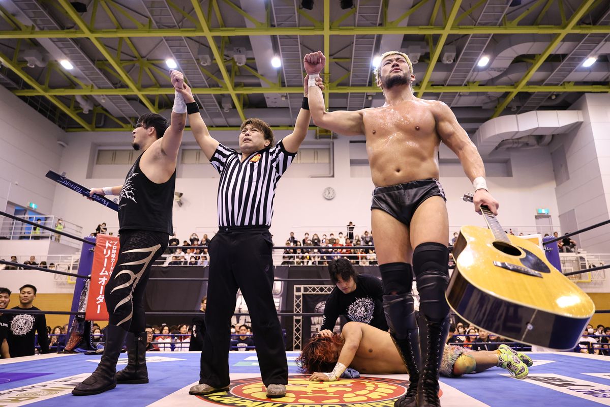 さらにSANADAがヒロムの腹部をギターで殴打し、決定的なダメージを与えた。