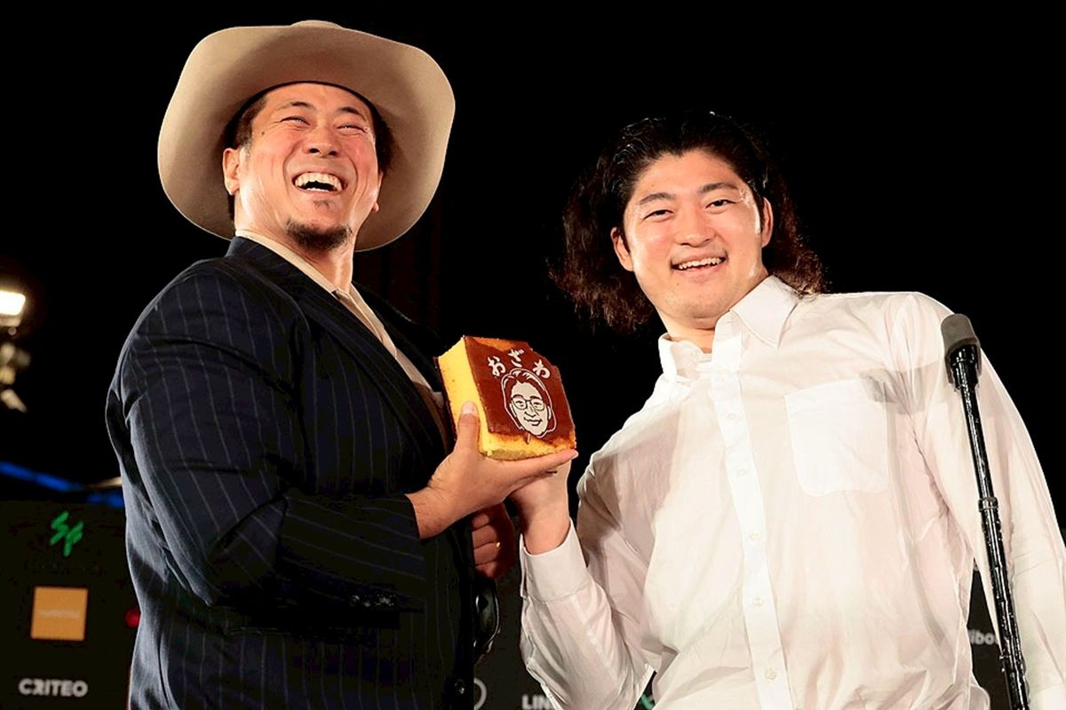 「足は歩くのもままならない状態」と悲痛な表情を見せつつも、王者への手土産として特製の「OZAWAカステラ」を持参した。