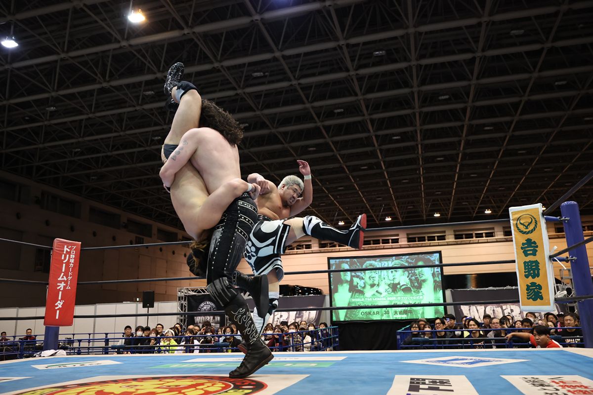 試合はOSKARと大岩の先発で始まった。OSKARは体格差を利してハンマースルーやボディスラムを狙うが、大岩は機動力を活かしたエルボーやドロップキックで応戦。