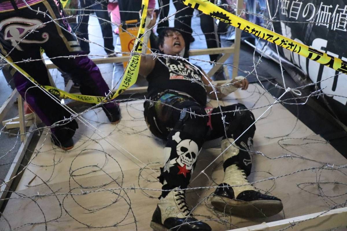ポーゴ組は大仁田の体を有刺鉄線でグルグル巻きにすると、間下が有刺鉄線ボード越しに大仁田にケンカキック。