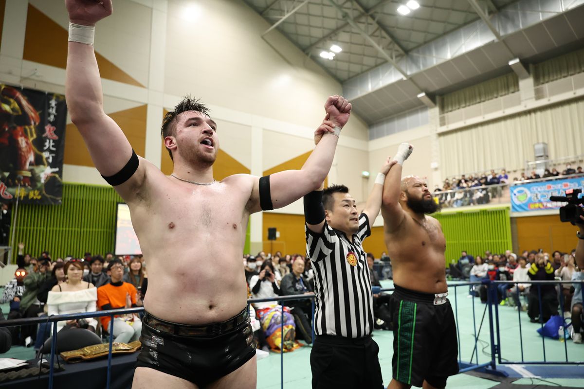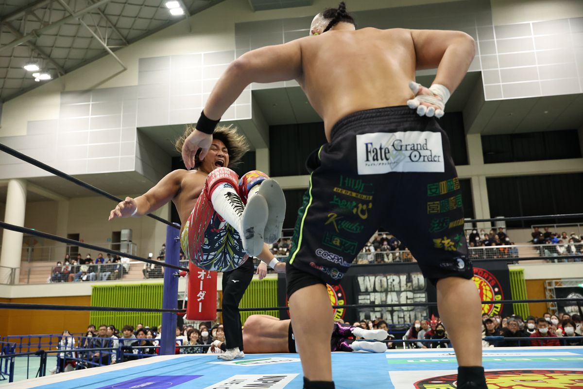 しかし、百戦錬磨のエースは相手のお株を奪うモンゴリアンチョップ連打で応戦し、ファンタズモへのエアギターパスという華麗な連係で会場を沸かせた。
