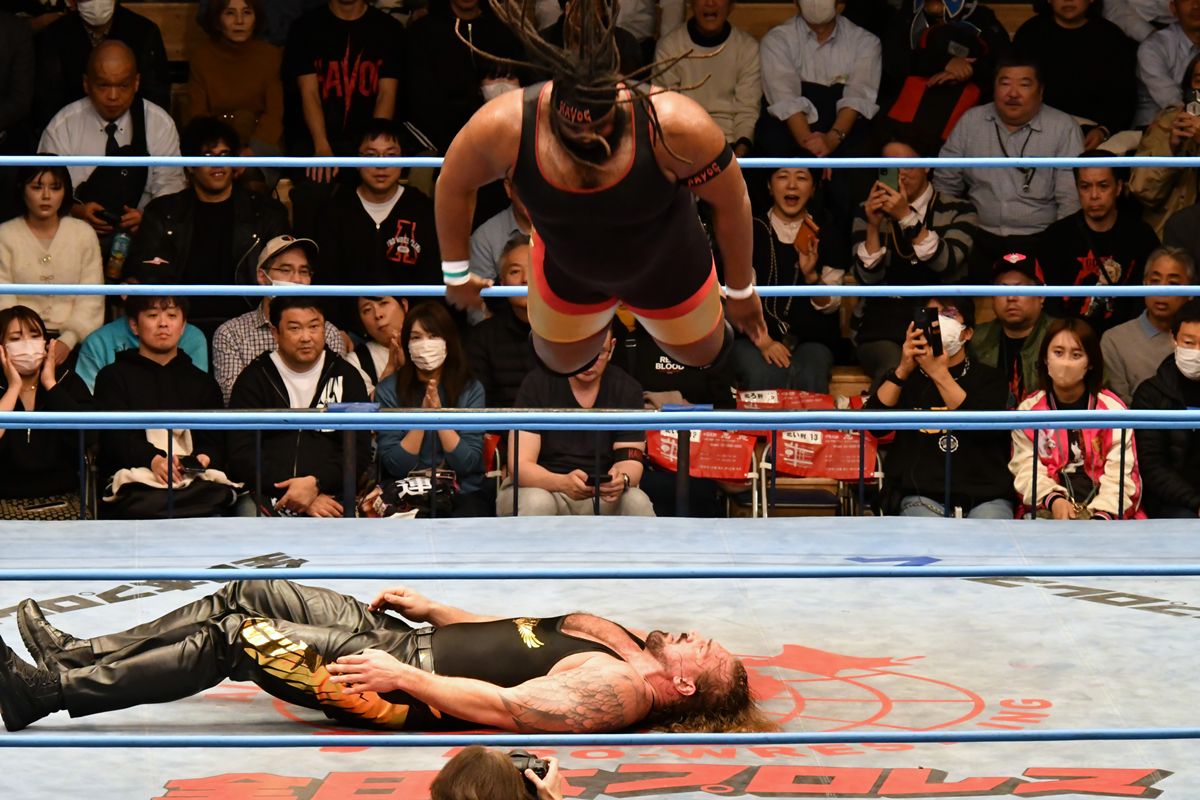 ザイオンを捉えると、綾部とタロースは豪快なダブルチョークスラムでマットに叩きつける。