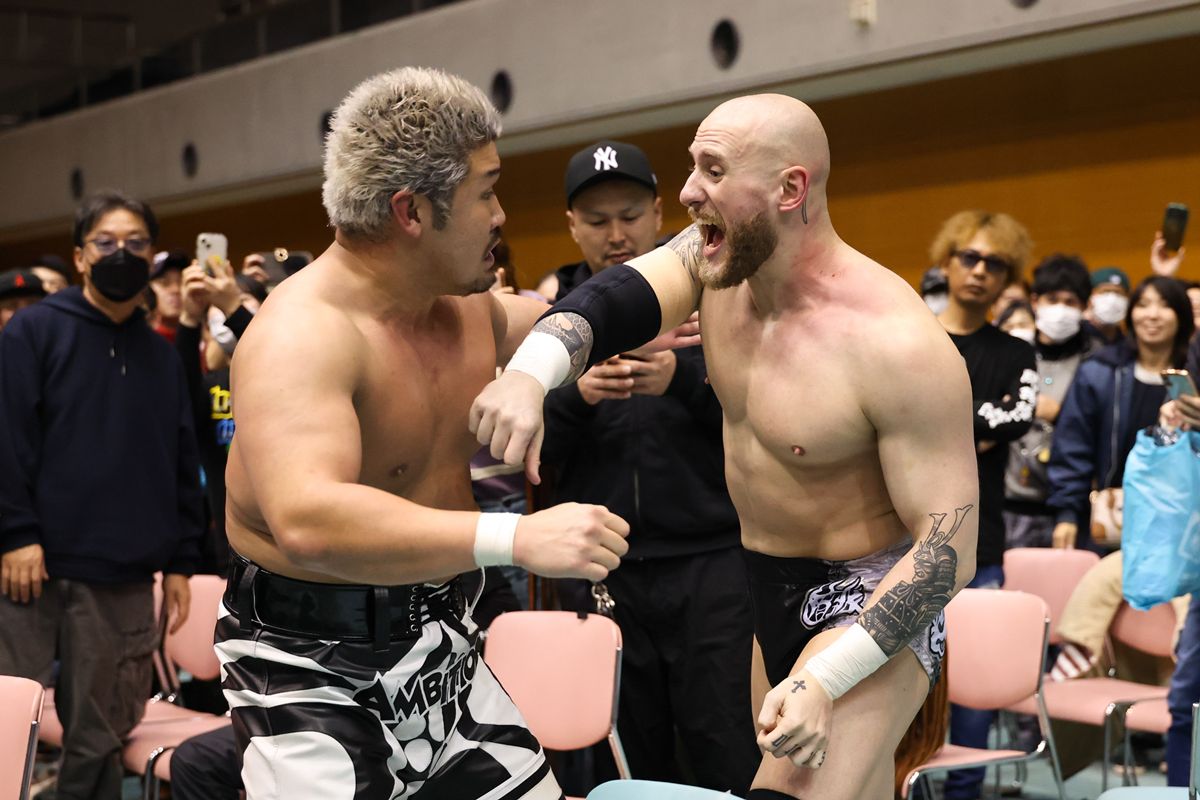 辻とIceが挑発し合えば、ゲイブとOSKARは重厚な逆水平チョップ合戦で火花を散らす。