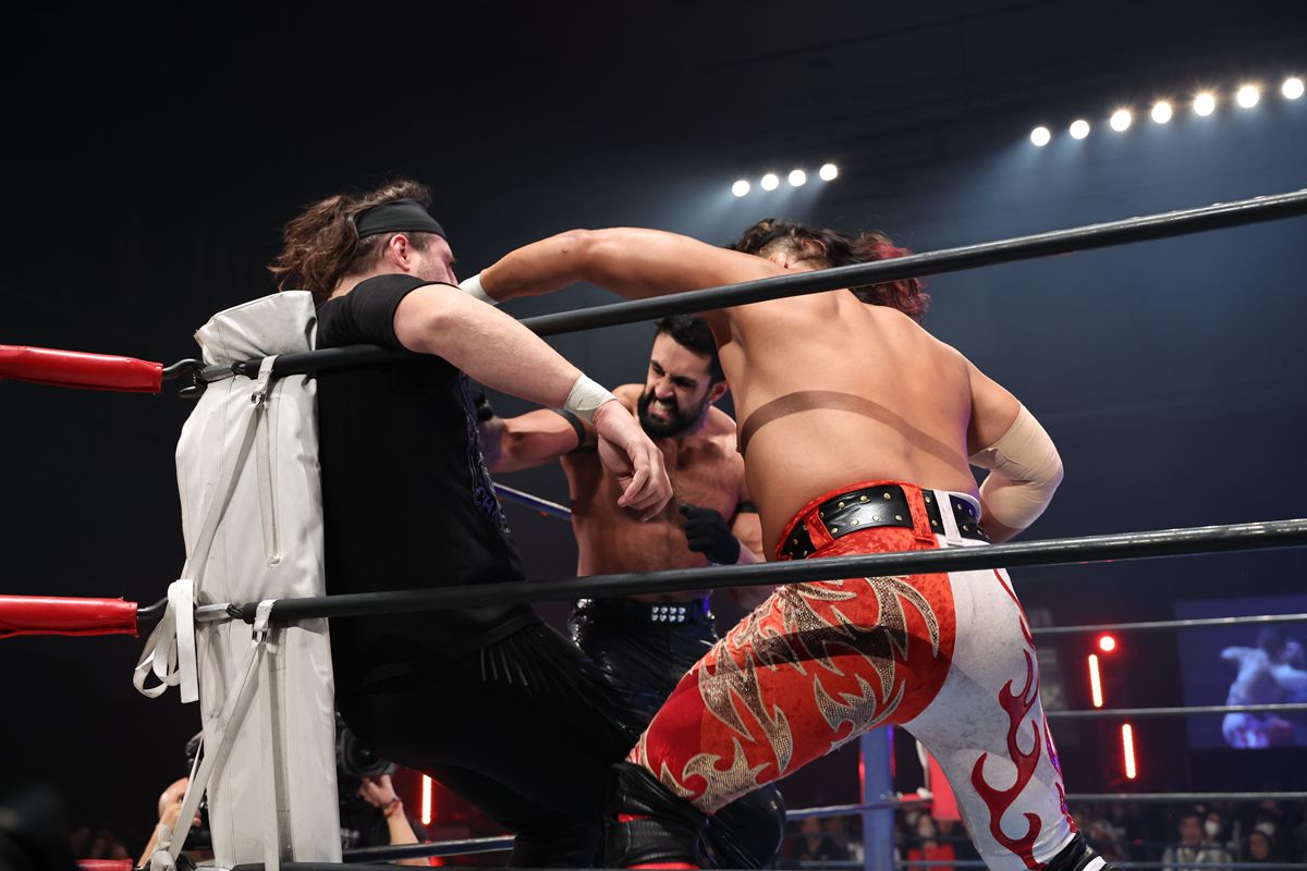 第4試合では、今シリーズで鮮烈な印象を残した“WAR DRAGONS”鷹木信悟&ドリラ・モロニー組が石森太二を加えたトリオで登場し、高橋裕二郎&チェーズ・オーエンズ&DOUKIのHOUSE OF TORTURE(H.O.T)と対戦。