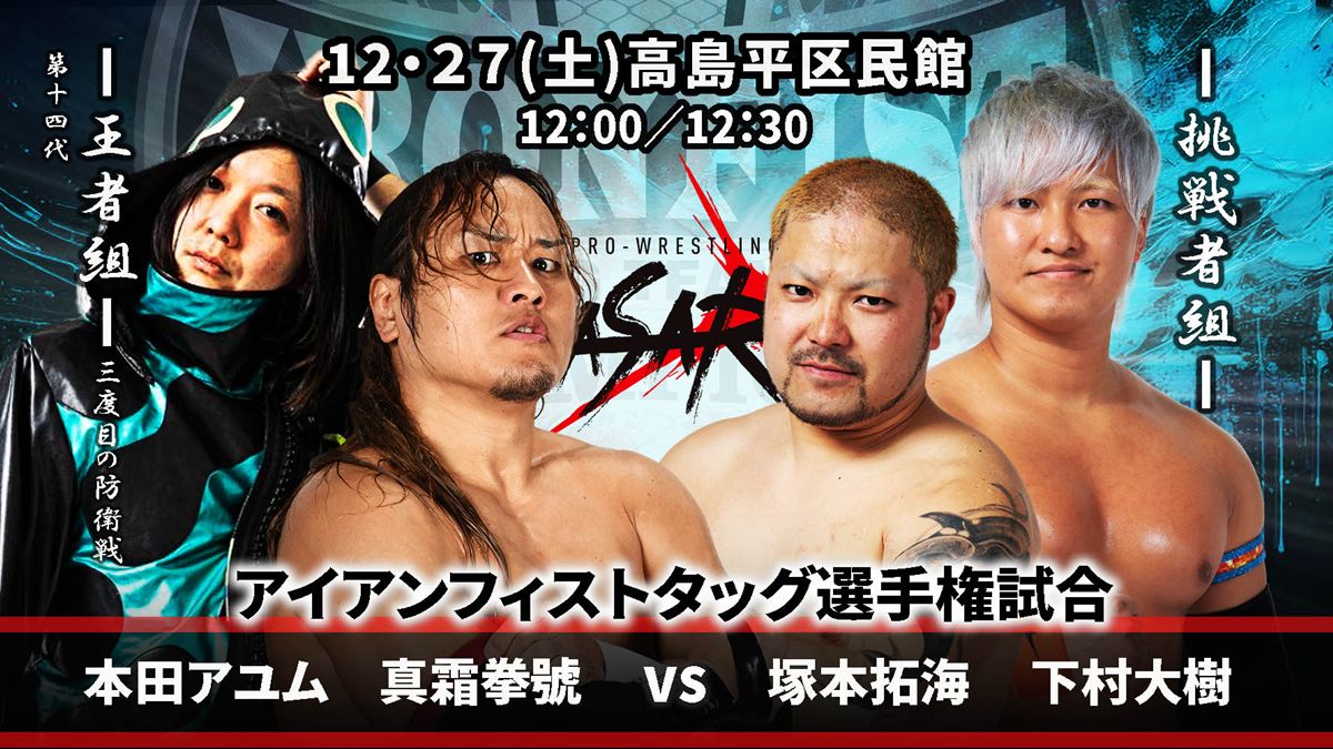 メインイベントでは「アイアンフィストタッグ選手権試合」が行われ、2AWの真霜拳號&本田アユム組が持つベルトに、BASARAの塚本拓海&下村大樹組が挑戦する。