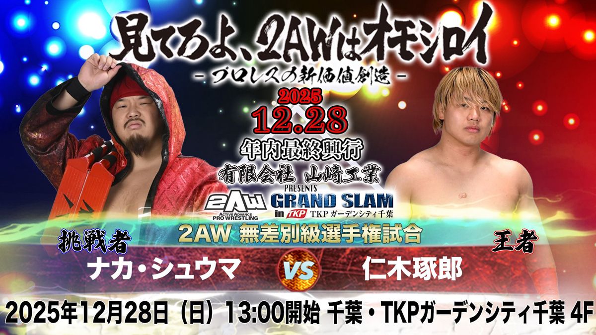 2025年12月28日、千葉密着・発信型プロレス2AW年内最終興行『GRAND SLAM in TKPガーデンシティ千葉』。 そのメインイベントで、団体の至宝・2AW無差別級王座を懸けて激突するのは、王者・仁木琢郎と、挑戦者・ナカ・シュウマだ。