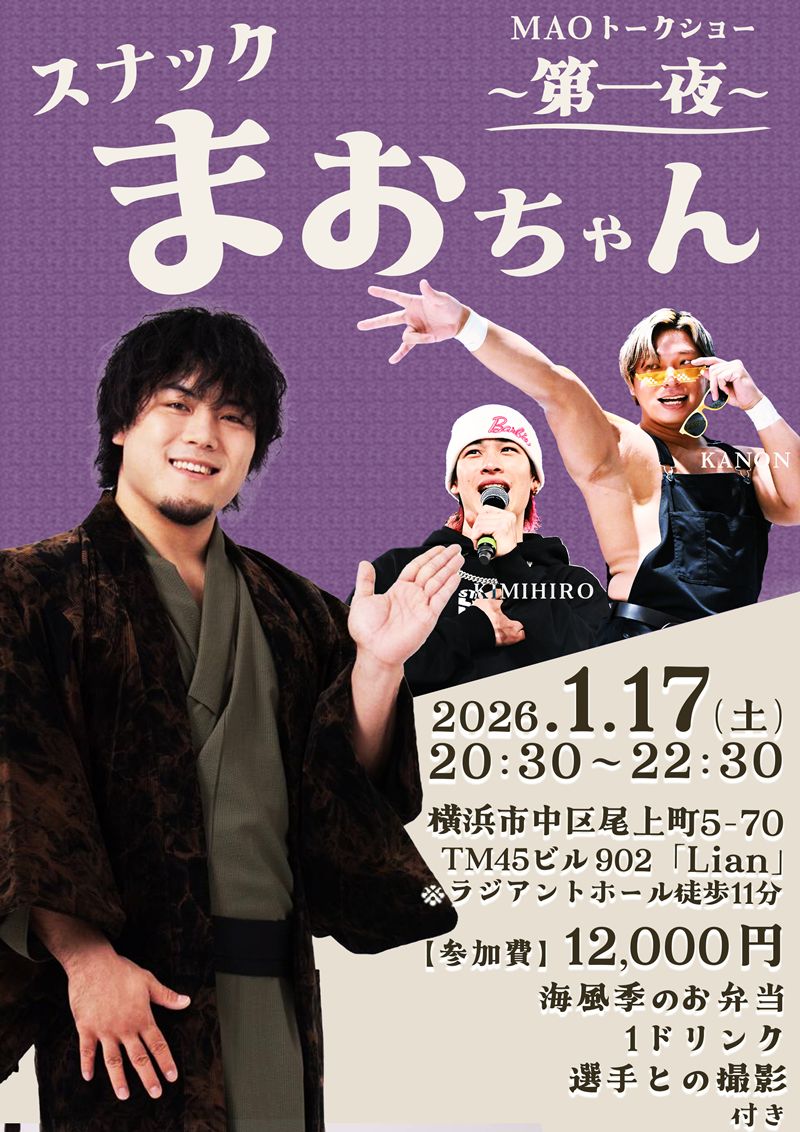 DDTプロレスは、2026年1月17日(土)の横浜ラジアントホール大会終了後に、MAOプロデュースによるトークイベント「スナックまおちゃん〜第一夜〜」を開催すると発表した。