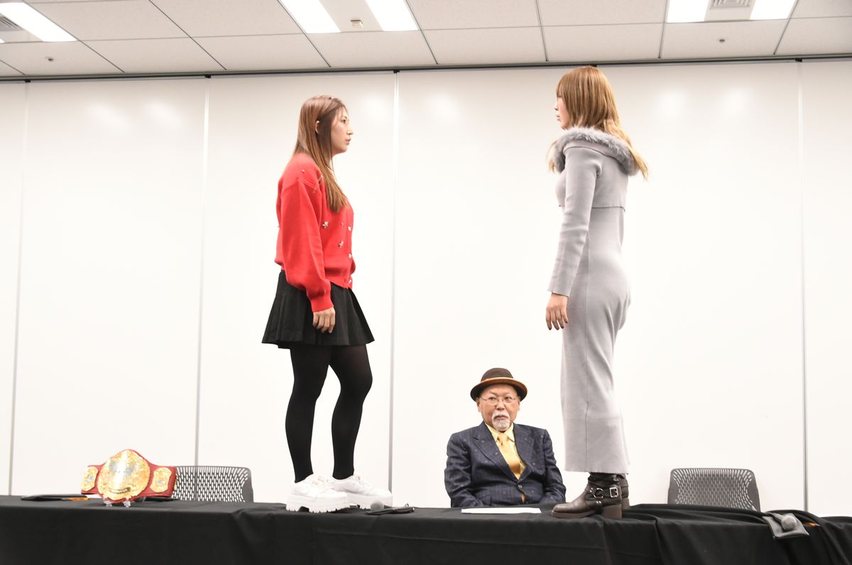 メインイベントで行われるマリーゴールド・ワールド選手権試合、第3代王者・青野未来(35)対挑戦者・桜井麻衣(35)の調印式は、両者の感情が爆発。
