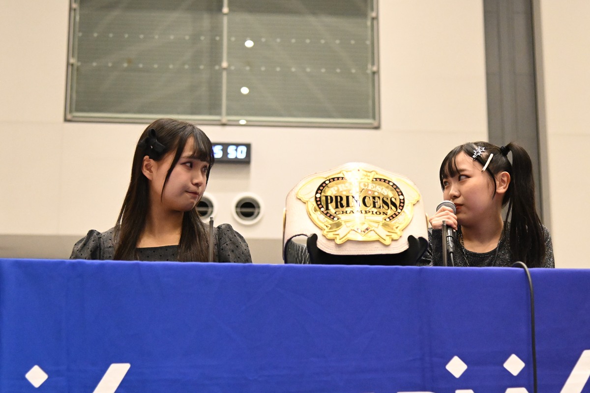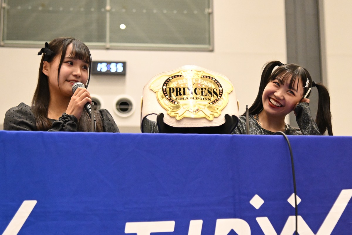 迎え撃つ渡辺は「先週私はタイでマッチャ選手に防衛を無事にしてきて、今回しっかり約束を守る形で鈴芽戦に臨むことができます。4度目の防衛戦になると思います 。ここからもっともっと強く輝いて、マッチャと戦ったことで、日本中もっともっと今すごく熱く思っているところです。鈴芽とは年齢が一つ違いで、入ったのが1年違いで、すごく自分のなかでプライベートなところとしても、近いものが多いので。たくさんいろんな話をしたり、もっとこうしたいね、東京女子のこういうところが好きだねとか…。たくさんずっと前から話している、好きをぶつけ合っているところがあります。ここでイッテンヨンで鈴芽と大好きな東京女子プロレスで、大好きを試合でぶつけ合えるっていうのはすごくうれしく思っています。でも私はプリンセス・オブ・プリンセスなので絶対に負けません。イッテンヨンが終わったら、(3月29日の)両国国技館が見えてきます。前回の両国国技館で私は1度目のプリンセス・オブ・プリンセスになったので、次必ずまたこのベルトを持って両国国技館に立って、 さらにその先の夢、もっといろんな多くの人を幸せにしたい。そのためにはもっともっと大きな会場、夢の一つである会場、(日本)武道館やさいたまスーパーアリーナや、もっといけば東京ドーム。そういうところに私たちの大好きな東京女子プロレスは幸せを広げていけると思っています。なので絶対に負けません。私たちの好きをぶつけ合いましょう」と必勝を期した。