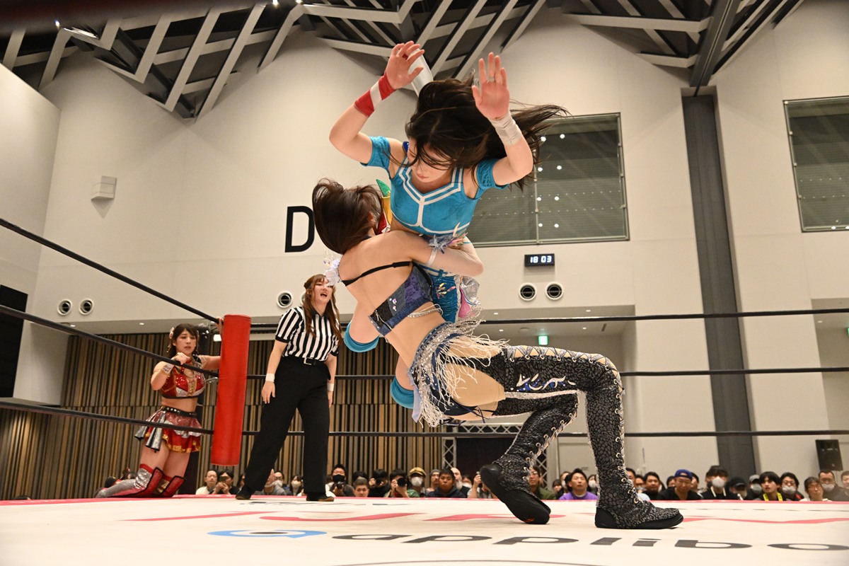 だが鈴芽をキャッチした渡辺が開花式ジャイアントスイング。上福が愛野を雪崩式ブレーンバスターでぶん投げると、愛野も愛と炎のフルネルソンで反撃もカット。風城がロープを利したドロップキックを繰り出しと、鈴芽がエプロンから断崖式フェースクラッシャーで渡辺を排除。最後は上福を捕獲した愛野がヴィーナスDDTの体勢に入ると、風城が両足を持ち上げて、そのままマットに叩きつける合体技(アップドラフト!!オーバードライブ)を決めて3カウントを奪った。