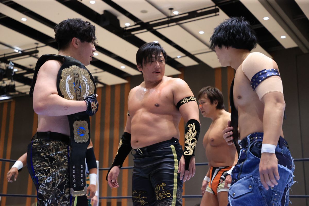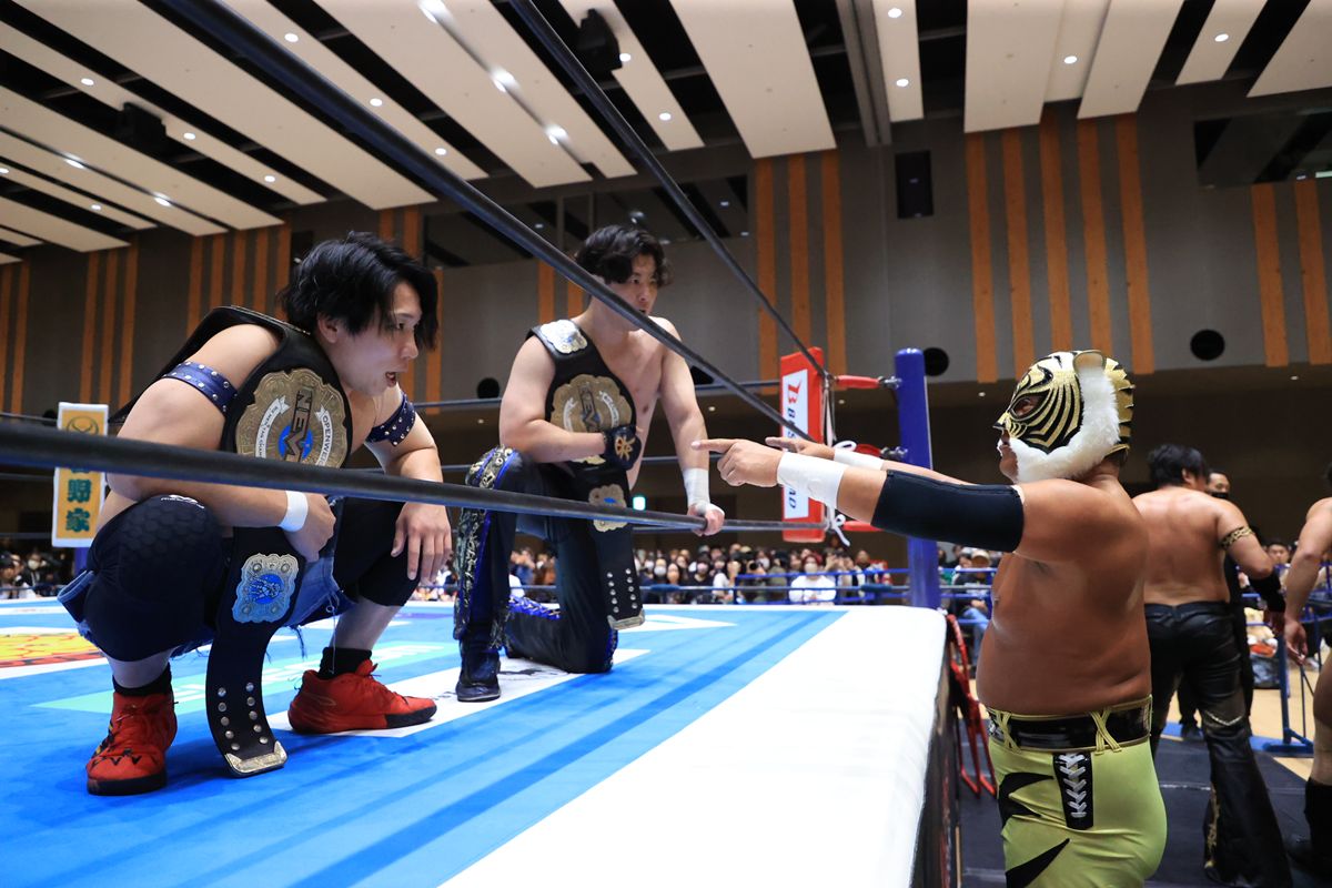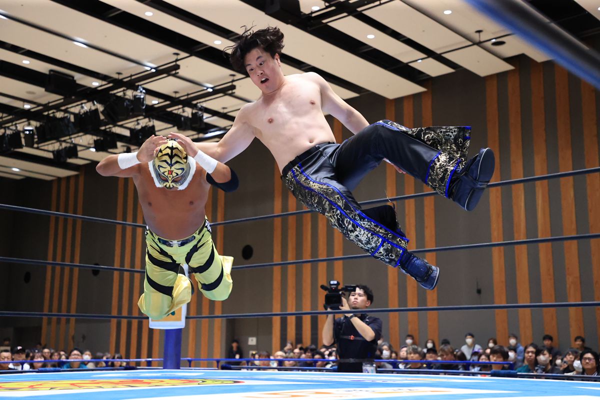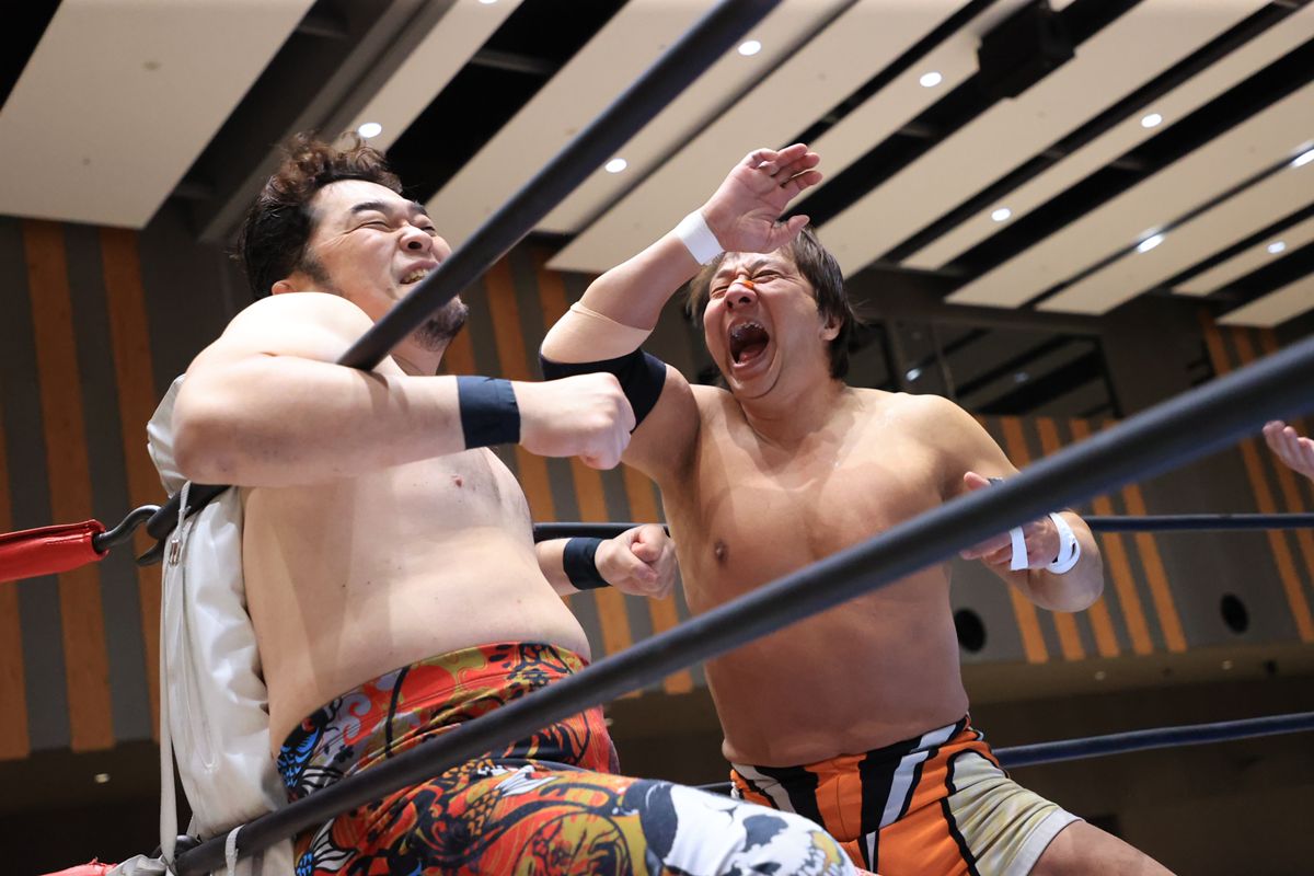 YOHがウルトラタイガードロップやドラゴンスクリューで畳み掛ければ、タイチもアックスボンバーやフロントキックで反撃し、一進一退の攻防を繰り広げる。
