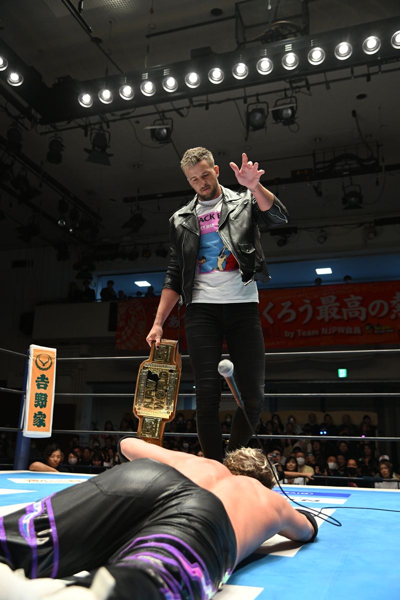 さらに「いま、新日本プロレス、6年間じゃない?まだまだ日本語、全然しゃべってない、けっこうダサいけど。助けてあげるよ!2026年、NJPW WORLD認定TV王座をオレとやろう。1.4ドームで会おうよ、じゃあね!」と挑発し、ベルトを放り投げて退場した。