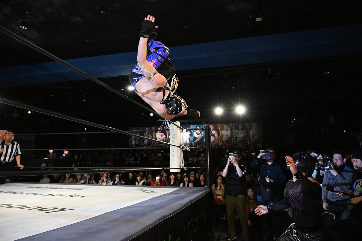 それでも隈取はイルシオンを場外に落とすと、反転式のトップロープ超えのトペコン・ヒーロを発射。ピンチに陥ったイルシオンは隈取をレフェリーにぶつけて、レフェリーが昏倒。その隙にイルシオンはイス攻撃、急所打ちも、隈取が急所打ちでやり返した。隈取はドロップキックからエア・ダブルエリオ(変型カンクーントルネード)を繰り出して3カウントを奪取した。