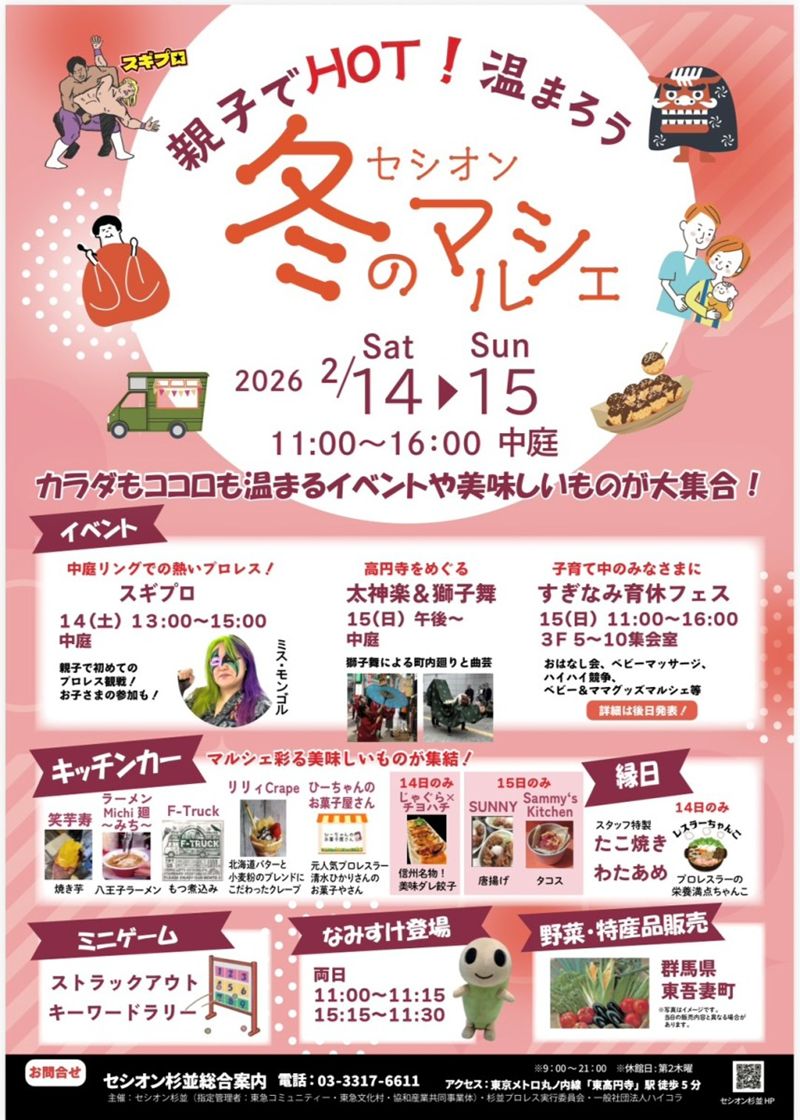 会場となるセシオン杉並では来年2月14日と15日に「親子でHOT!温まろう セシオン冬のマルシェ」を開催するが、その初日にスギプロがイベントプロレスを行う。試合は4試合程度で、そのほか、リング上でプロレスラーが指導するプロレス教室、トモダチプロジェクトダンス(杉並区の子どもたちが歌とダンスでつながり合うプロジェクト)、プロレスグッズ販売会を予定。元アクトレスガールズの清水ひかりさんのお菓子屋さんを始め、キッチンカーも多数出店。杉並区のマスコットキャラクターのなみすけも来場する。