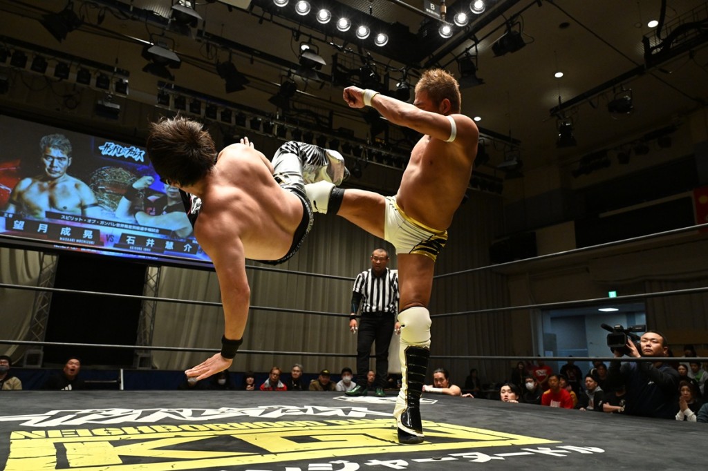 石井はソバットからニールキック。高角度ダブルアームDDTも決められず。再度のニールキックは望月が蹴りで叩き落とした。望月はローキック、真・最強ハイキック、ツイスターもカウント2。ならばと望月は三角蹴りを見舞って3カウントを奪った。