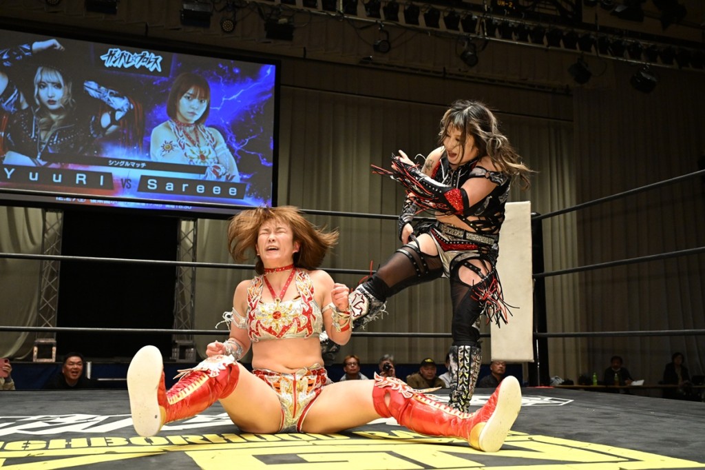 Sareeeからの握手を拒否したYuuRIはドロップキックで奇襲。怒ったSareeeは髪をつかんでぶん投げて逆襲。YuuRIは顔面ウオッシュ、エプロンを走ってウルトラタイガードロップ。Sareeeは雪崩式フィッシャーマンズ・バスター、ダイビング・フットスタンプはYuuRIが回避。