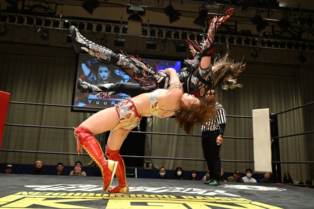 激しいエルボーの打ち合いとなり、Sareeeがダイビング・セントーン、ダイビング・フットスタンプもカウント2。YuuRIがジャーマンを放てば、Sareeeもジャーマンで返す。