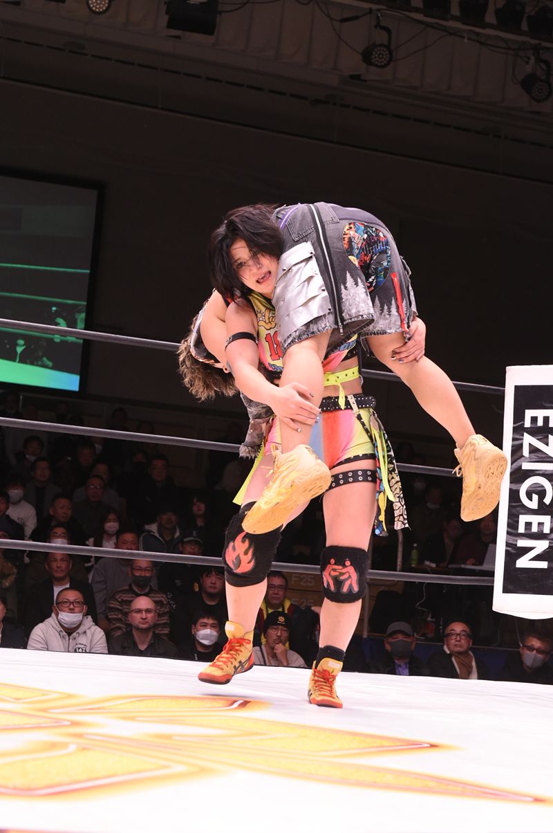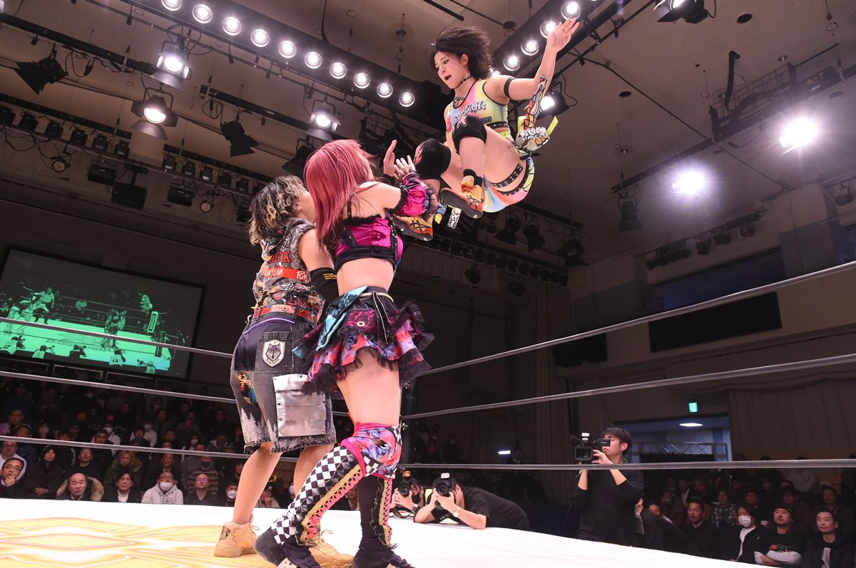 心希のピンチに飛び込むと、息の合ったダブルドロップキックを炸裂させ、さらに場外へ逃れた王者組へプランチャを見舞い、流れを強引に引き戻した。