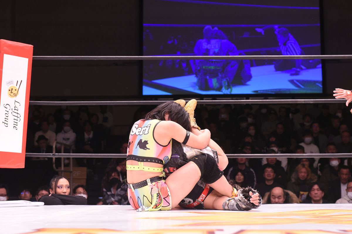 聖怜が下から身体をひっくり返し、執念のダイヤル固めでCHIAKIを捕獲。王者の抵抗をねじ伏せ、電光石火の3カウントを奪取したのである。