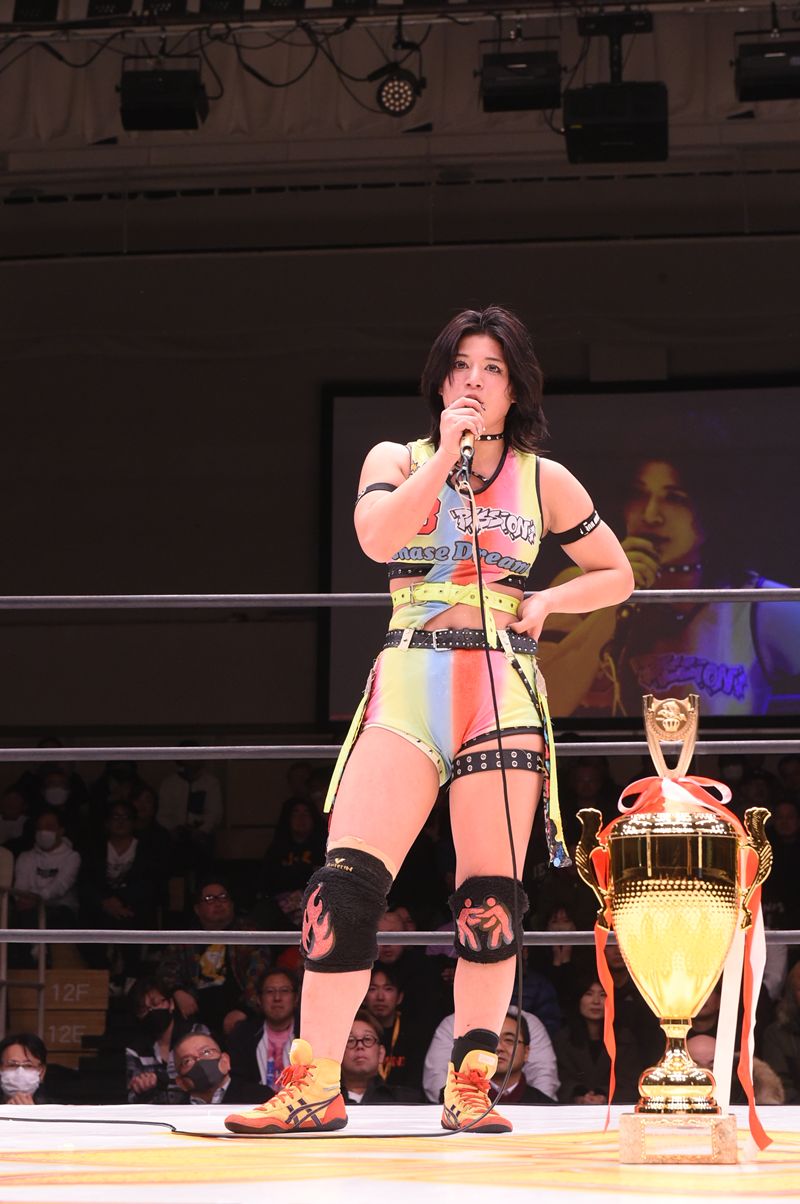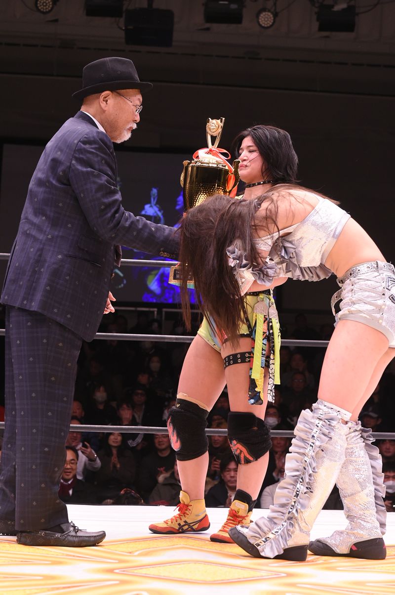 最後は出場選手全員で「シャインフォーエバー、マリーゴールド!」と合唱し、激動のトーナメントを締めくくった。主力の脱落というアクシデントを乗り越え、自らの手で時代をこじ開けた19歳と17歳。マリーゴールドのリングに、新たな風が吹き荒れる予感をさせた一夜であった。