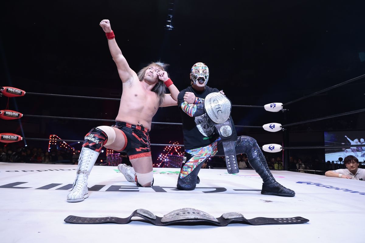 第7試合のGHCタッグ選手権試合では、王者・丸藤正道&拳王組に対し、挑戦者としてBUSHIと当日発表のパートナー「X」が対峙した。そのXの正体は、昨年5月に新日本プロレスを退団し、海外マットを主戦場としていた内藤哲也であった。