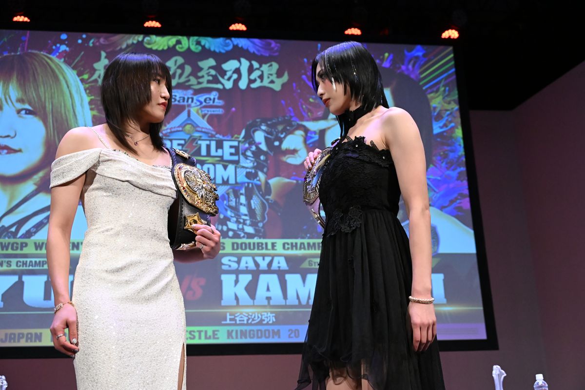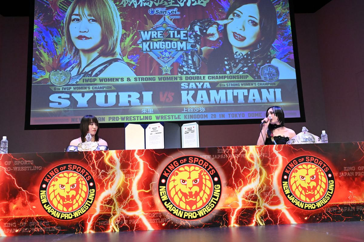 現IWGP女子王者・朱里と、現STRONG女子王者・上谷沙弥が登壇し、互いのベルトとプライドを懸けた最終調整を行った。