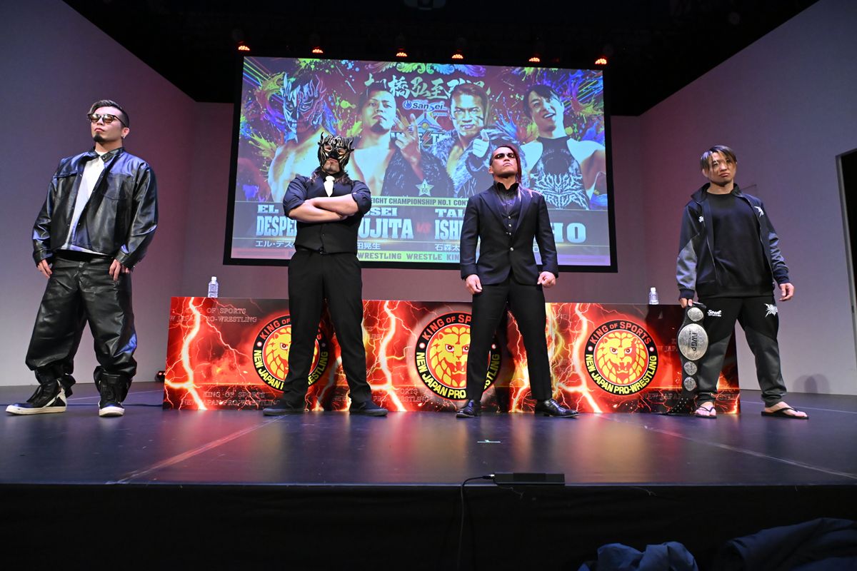1.4東京ドーム大会で行われる「IWGPジュニアヘビー級王座 次期挑戦者決定4WAYマッチ」。出場するSHO、石森太二、藤田晃生、エル・デスペラードの4選手が出席したが、肝心のIWGPジュニア王者・DOUKIは会見を欠席。代読された手紙が波乱を呼んだ。