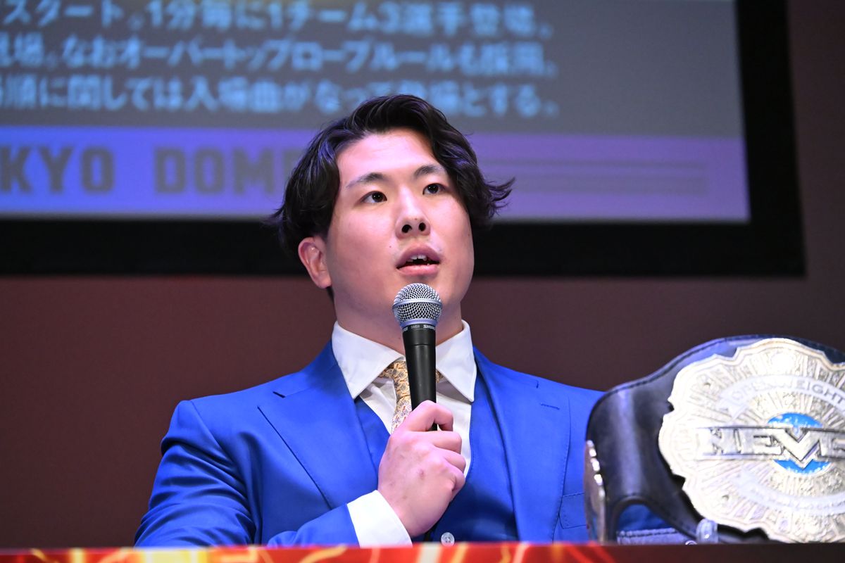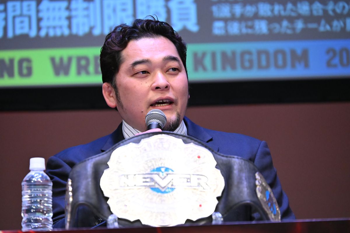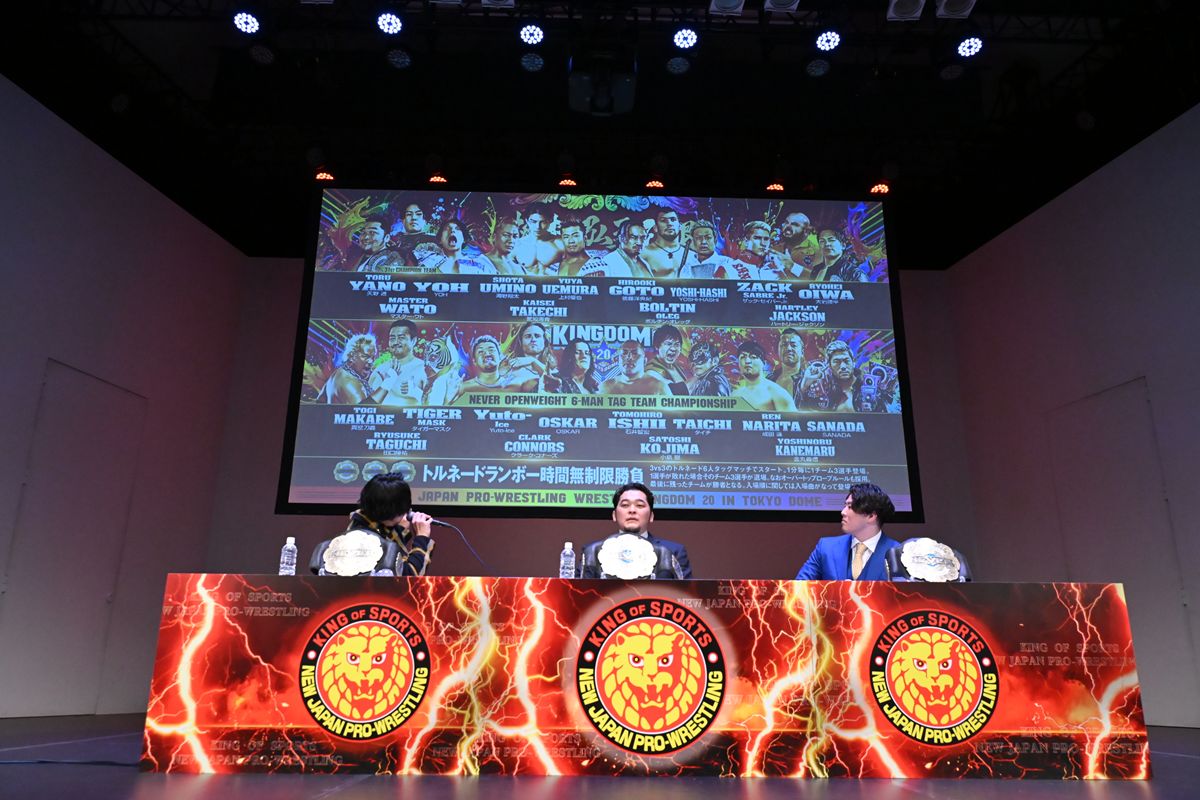 4日に行われる東京ドーム大会で、「NEVER無差別級6人タッグ選手権試合トルネードランボー」に臨む王者組として、矢野通、マスター・ワト、YOHの3選手が出席。総勢7チーム以上の挑戦者が入り乱れる大混戦を前に、YOHが奇想天外な作戦をぶち上げた。