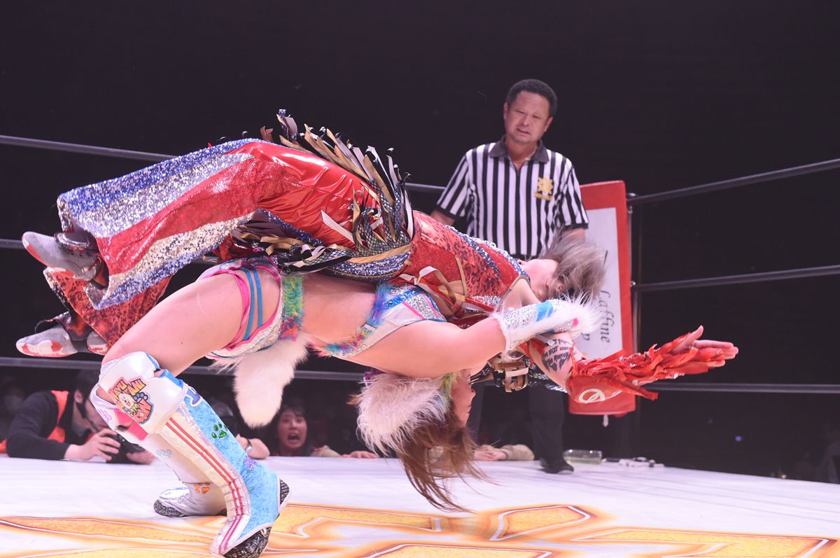 彩羽が雪崩式パワーボムを狙った刹那、岩谷は空中で体勢を入れ替え、起死回生の雪崩式フランケンシュタイナーを敢行。