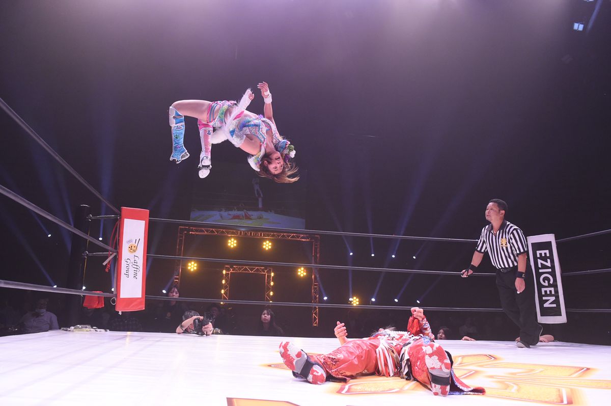 彩羽のバカタレキックを食らいながらも、カウンターのドロップキックで巨体を場外へ吹き飛ばすと、今度こそとばかりにトペ・スイシーダを完璧に決めてみせた。