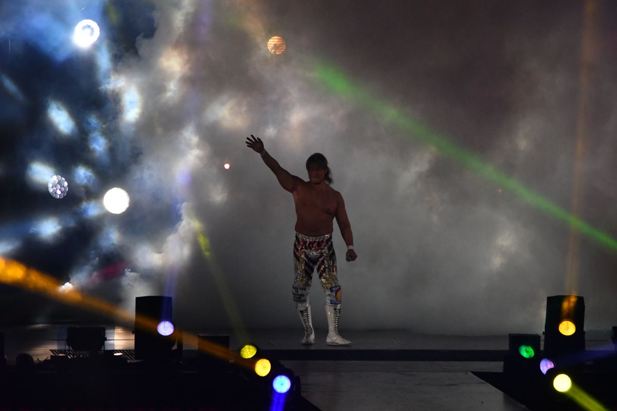 その後、エアギターを披露し「ウェーブやりましょう」と呼びかけた。外野席も開放し座席がすべて埋まっているからこそできるイベントに、棚橋は感無量だった。