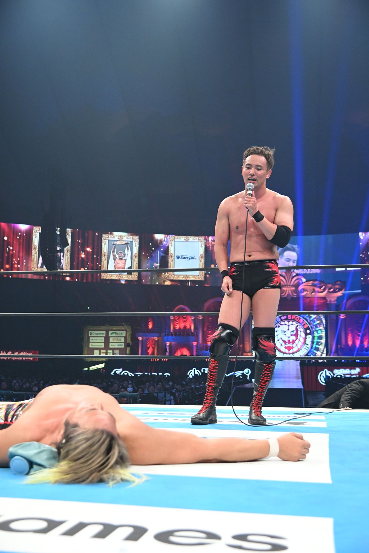 オカダ「ありがとうございました。まぁね、まぁね、まぁこの引退試合、一度お断りしましたけど、こうやって、やって良かったなと思います。まぁね、引退する相手に手こずるわけにはいかないですから、僕がね、この(AEW)インターナショナルのベルトのチャンピオンとして来てますから、AEWを代表して来てますから、しっかりとオカダ・カズチカの今の強さを見せつけられたんじゃないかなと思います。まぁそうっすね、久しぶりに新日本プロレスのリングに上がれて良かったですし、さすが棚橋弘至だなと改めて思いました。じゃあ僕がね、引退するってなった時に東京ドームを超満員にできるかって言われたら怪しいと思いますし、やっぱりね、今回の東京ドーム超満員ってのは棚橋さんのね、26年間があったからこその東京ドーム超満員だったと思いますんで、まぁさすがだなと、素晴らしいなと思います」