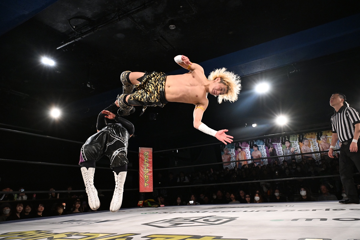 また、同じAブロックでは石田有輝が高校2年生の佐藤大地と激突。佐藤は昨年4月にHEAT-UPから移籍し、「DGC」初出場。両者のデビューは1ヵ月違いで、プロレスキャリアでは同期となる。石田がフライングどすこい、雪崩式ブレーンバスター、小股すくいスープレックスで攻め立てると、佐藤はミドルキック、ジャーマンで反撃。石田が猫だましからどすこいクラッチも2カウント。佐藤はファイアーサンダーから重爆マッドスプラッシュを投下してトドメを刺した。佐藤は「勝ったぞ! この勢いで2試合目、3試合目、4試合目勝って、優勝するよ!」と優勝宣言。