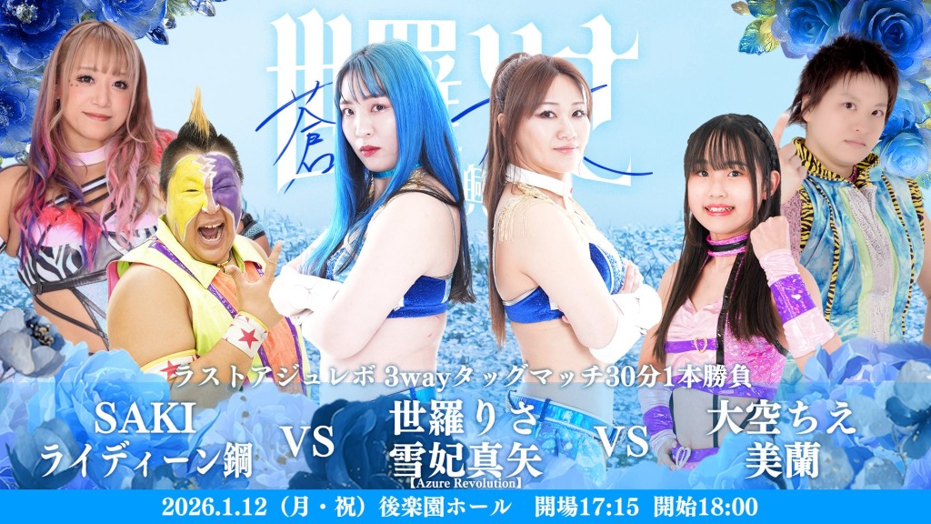 また、世羅りさと雪妃真矢によるタッグチーム「アジュレボ(Azure Revolution)」も最後となるが、SAKI&ライディーン鋼、大空ちえ&美蘭を迎え、3WAYタッグマッチでその華麗な連携を見せ納める。