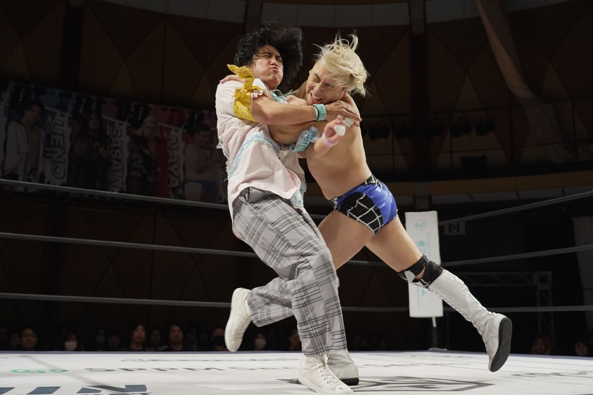 また、同じBブロックでは開幕戦で星を落とした瑠希也が、初戦で白星をマークした夢虹と対戦。ともに地元・大阪出身同士の激突となった。夢虹からの握手を拒否した瑠希也だが、夢虹はその場跳びムーンサルト・プレスや前転からのスタナーなど立体的な攻撃に大苦戦。