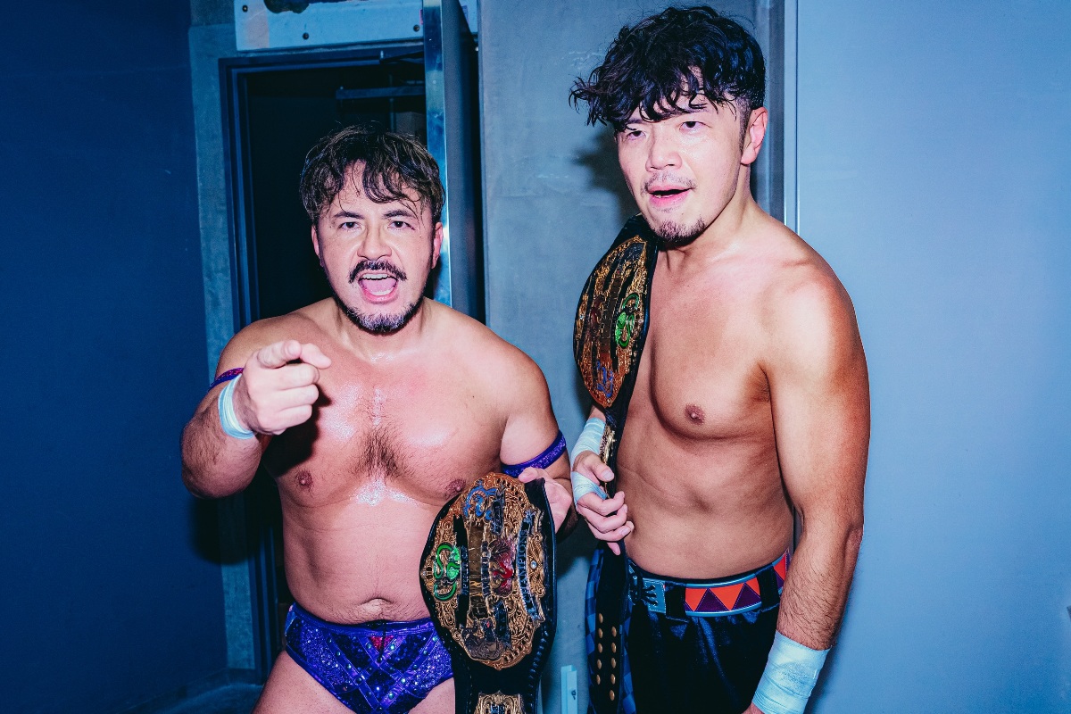 今成は「防衛戦きついよ。でも、今日、鈴木みのる&勝村周一朗から勝ちました。“プロレス王”鈴木みのるから直接白星はつけてないが、チームとしては勝利した。俺たちがずっと仰ぎ見て来た鈴木みのるにコンタクト取ったんだ。プロレス界の泥水からすすってきて、ついにプロレス王に触れたぞ。これで終わりじゃない気がするぜ。中間管理職なめんじゃねぇぞ。俺たちは中間管理職の希望の星。中間管理職、立ち上がれ。君たちもいつかキングに触れるはずだ。それまで俺たちはベルトを守り続ける」