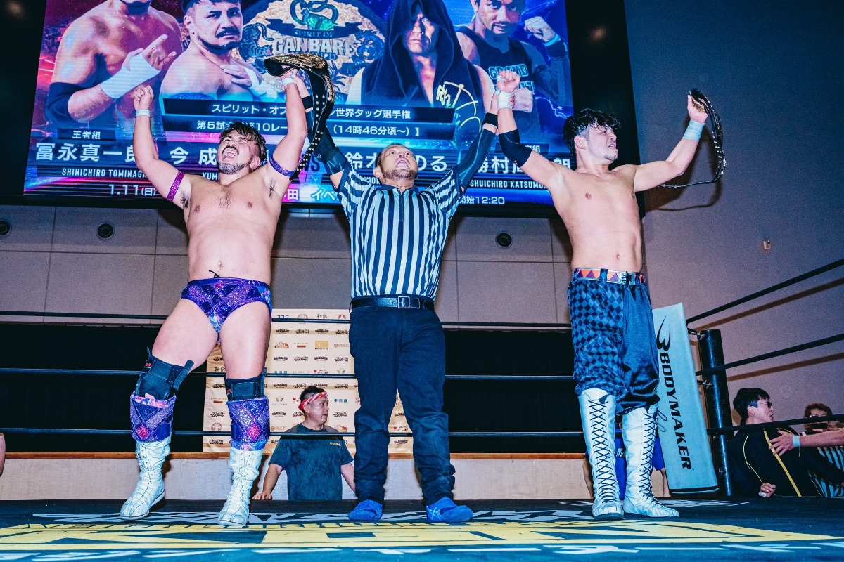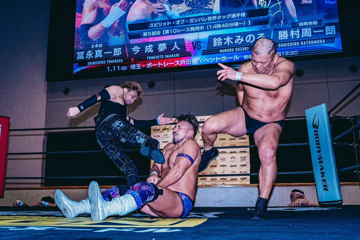 ガンバレ☆プロレスが1月11日、「WINWINパーク戸田9周年記念」を開催中の埼玉・ボートレース戸田の1Fイベントホールでコラボ大会『TODA SPECIAL MATCH』を行い、スピリット・オブ・ガンバレ(SOG)世界タッグ王者組の今成夢人&冨永真一郎(タッチャブル)が“超難敵”の鈴木みのる&勝村周一朗を退け、王座初防衛に成功した。