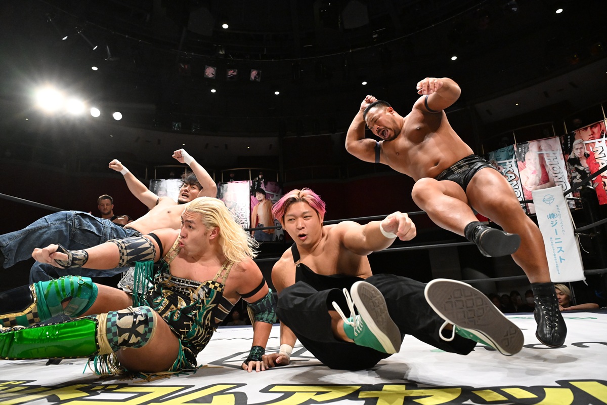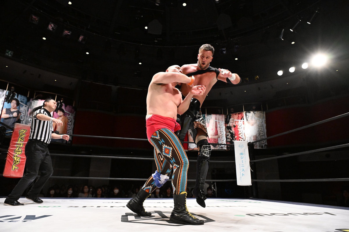 「ユニットシャッフル」とあって、MAO、クリス・ブルックス、飯野雄貴がチームを結成し、KANON&アントーニオ本多&納谷幸男と対戦。まずはタッグパートナーの飯野と納谷がショルダータックル合戦で大肉弾戦に。続いて、MAOとKANONがやり合った。MAOと飯野がKANONと納谷にThe Apexエルボーを試みるも失敗。クリスと本多は場外戦にまで発展して激闘に。