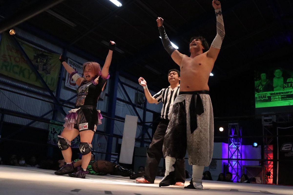 ◯滝澤大志(2AW)&◯笹村あやめ(2AW) vs 石川修司(フリー)&●ZONES(プロレスリングEvolution)