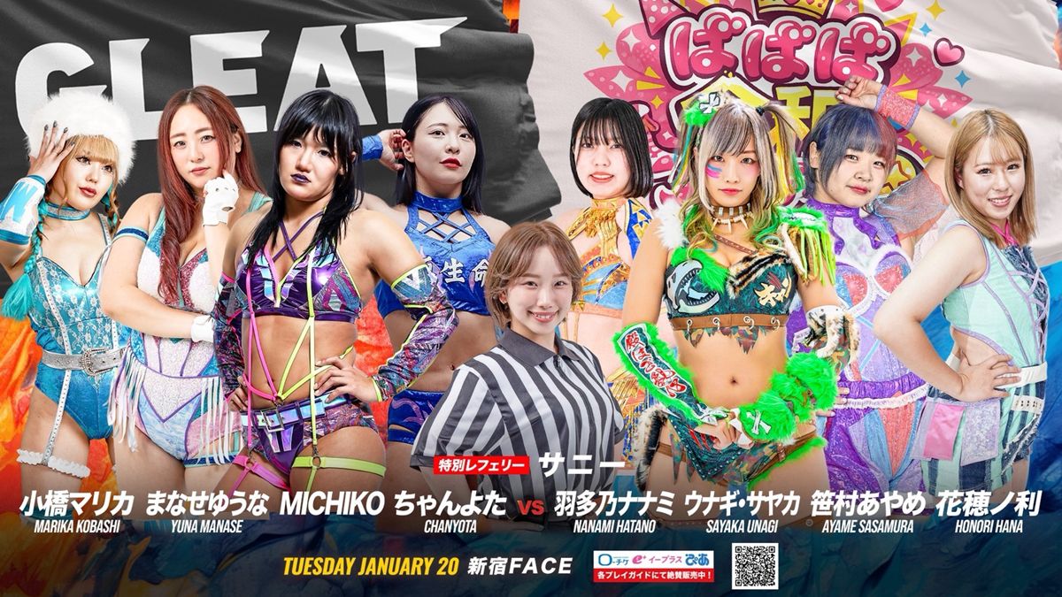 今回は「ぱぱぱ令和パーティー」の仲間である笹村あやめ、花穂ノ利、羽多乃ナナミを引き連れ、MICHIKO率いるGLEAT女子軍(まなせゆうな、ちゃんよた、小橋マリカ)と8人タッグマッチで激突する。