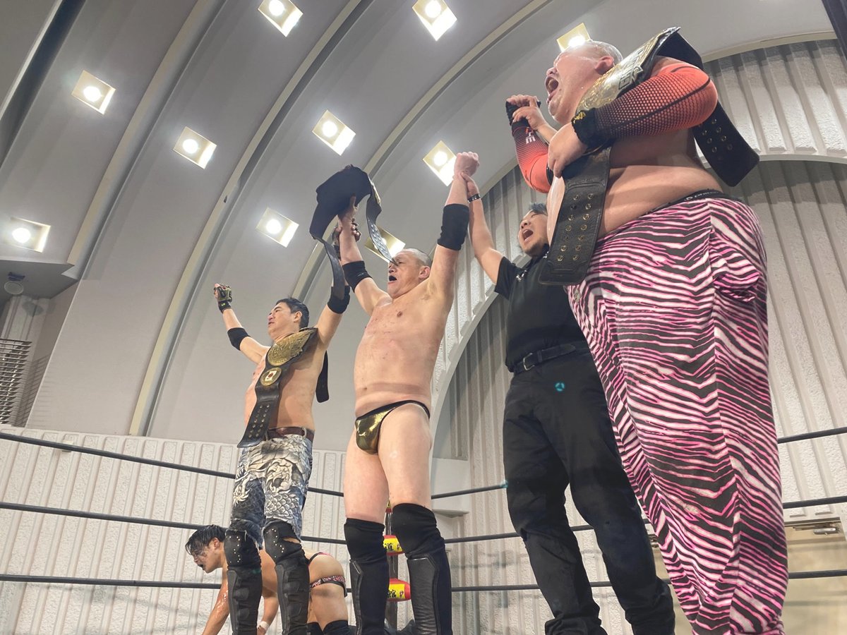 水風船やバケツの水が飛び交う地獄絵図の中、寒さに震えながらも意地を見せたのは挑戦者組だった。最後は星野勘九郎が粘る吉野達彦を捕らえ、Gショックラッチで3カウントを奪取。 17分45秒の“冷戦”を制し、小林&伊東&星野組が第51代王者組としてベルトを巻いた。