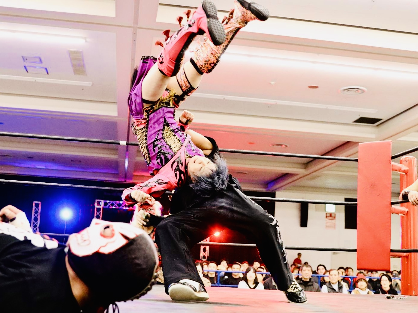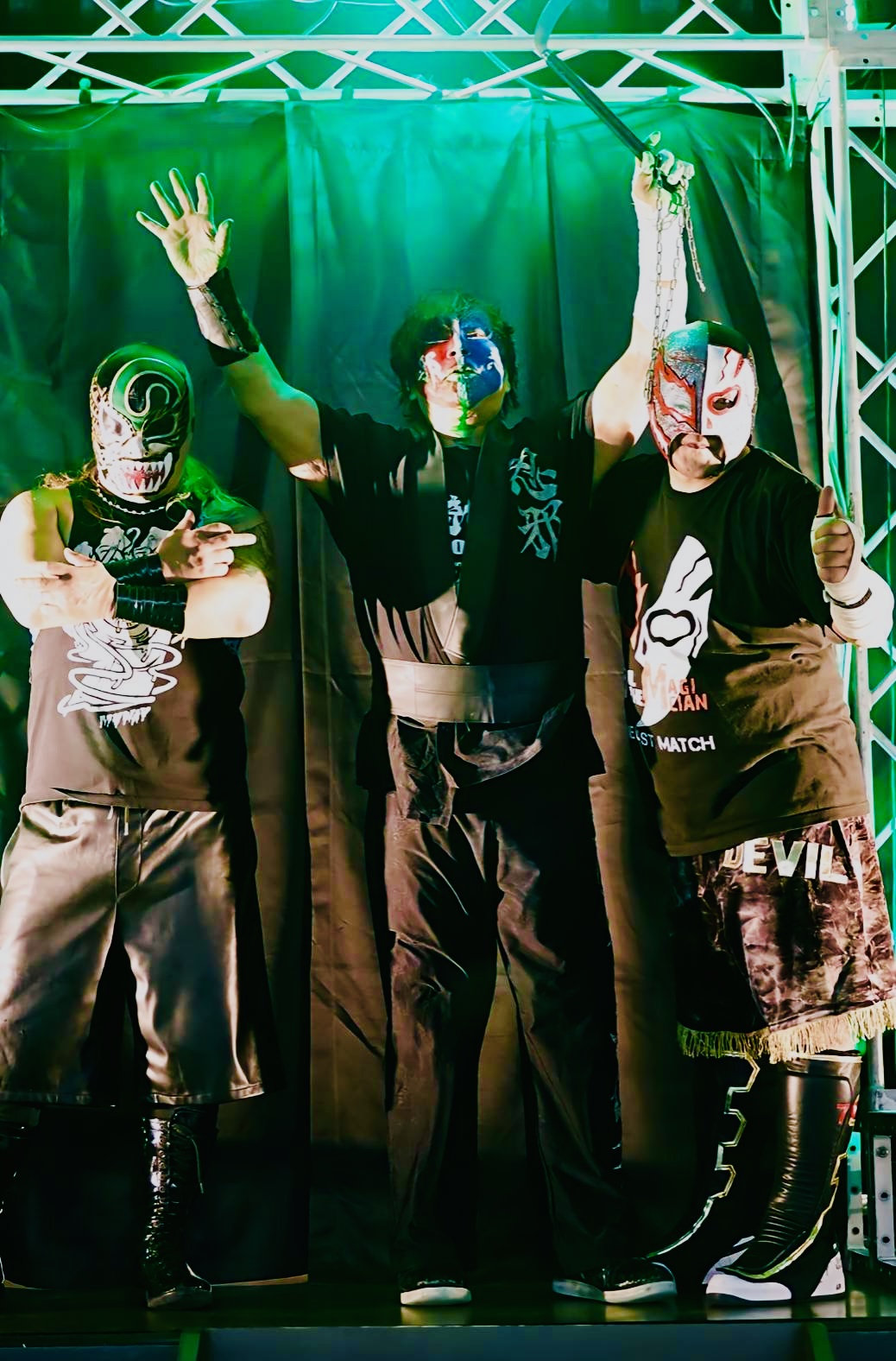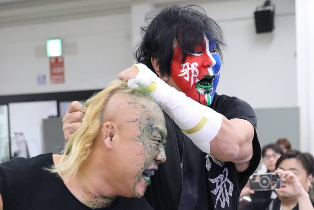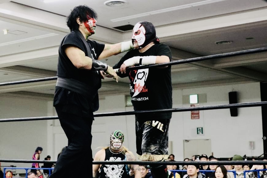 最後はデビルが開本を捕らえ意表を突いた火炎攻撃を浴びせ、怯んだ開本にすかさずニタがネックブリーカードロップ、そしてネグロがフライングボディプレスを畳みかけ、タッグ初めてとは思えない好連携でスリーカウントをダッシュした。