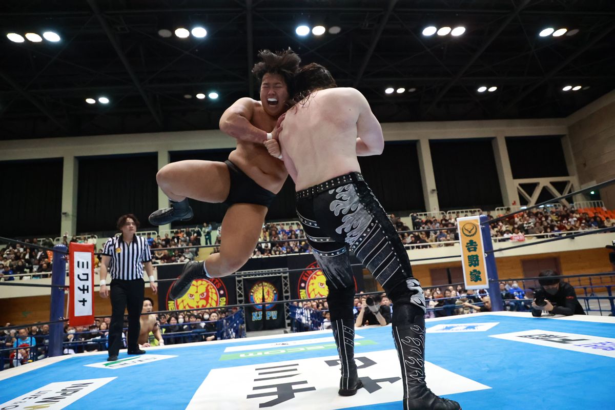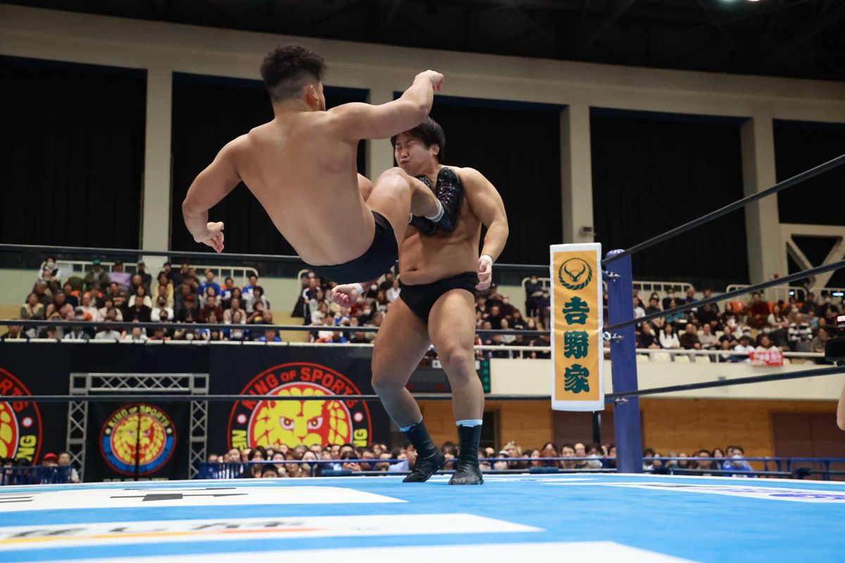 第2試合では、階級を超えた王者対決と『ヤングライオン杯争奪トーナメント』を見据えた若獅子たちの闘志が交錯する6人タッグマッチが組まれた。