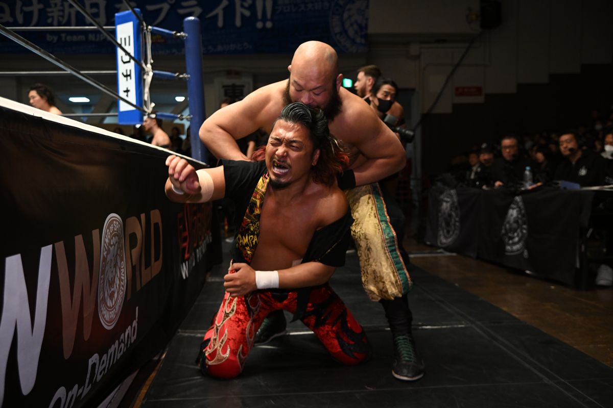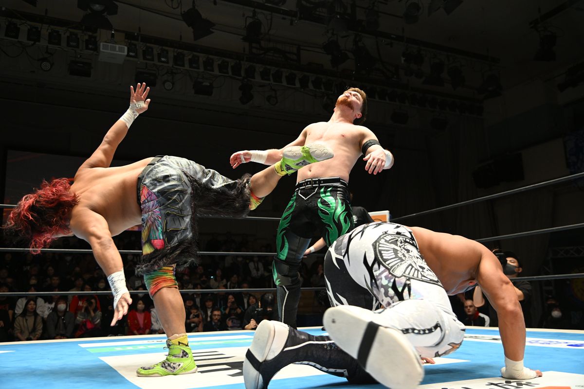 終盤、ダメージを負った鷹木が孤軍奮闘するも、オーカーンのベアハッグや王統流正拳突き、カラムのサッカーボールキックと、脇腹への集中砲火を浴びる。