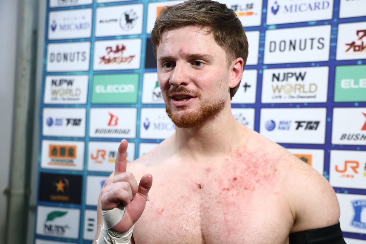マイクを握ったジェイクは「辻陽太、お前の仲間はみんな俺が倒しちまった。次はお前だ。ベルトを懸けろ」と、淡々とした口調ながらも絶対的な圧力で挑戦を迫った。