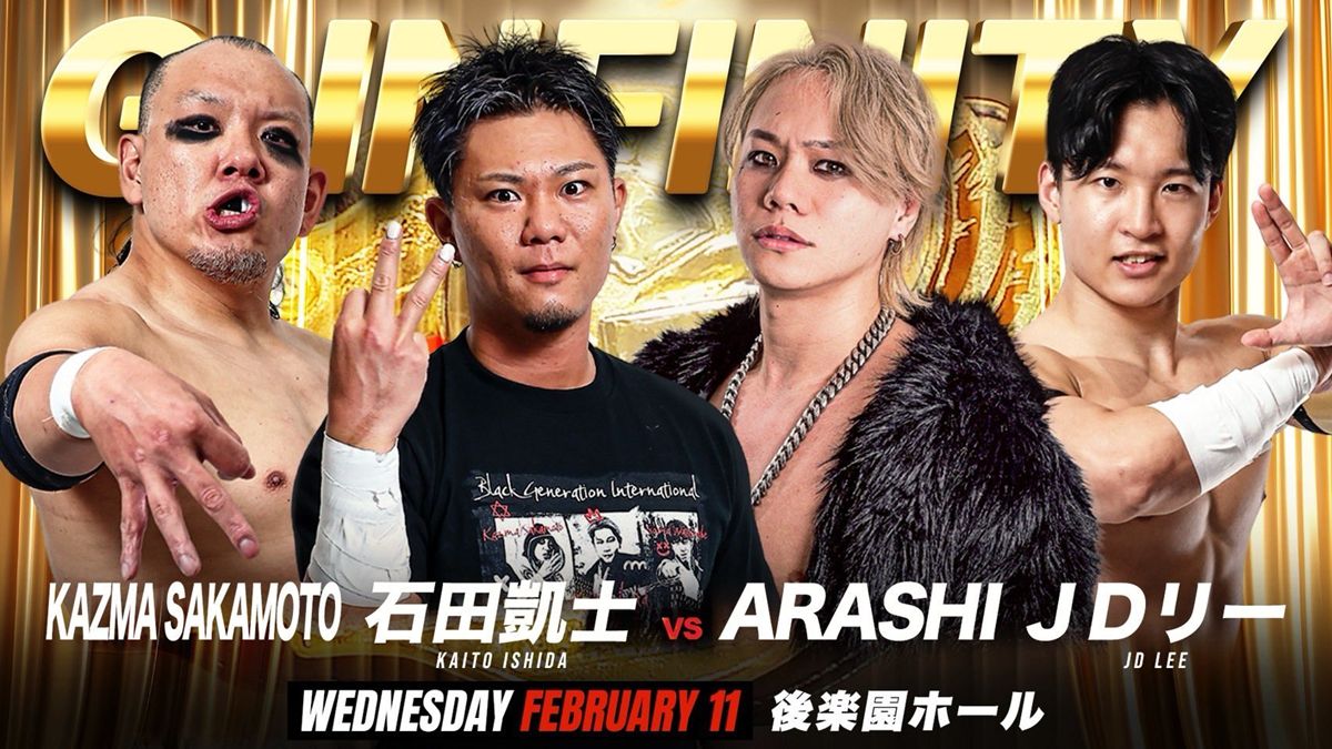 G-INFINITY選手権試合では、王者組の石田凱士&KAZMA SAKAMOTOに、同じユニット「BLACK GENERATION INTERNATIONAL(BGI)」のARASHI&JDリーが挑む。