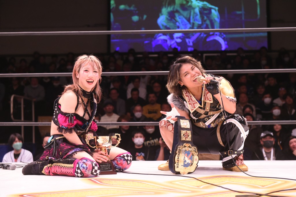 【マリーゴールド】CHIAKI&松井珠紗がツインスター王座V4成功も…青野未来「もらい事故みたいなもん」 挑戦迫るCHIAKIを痛烈一喝!