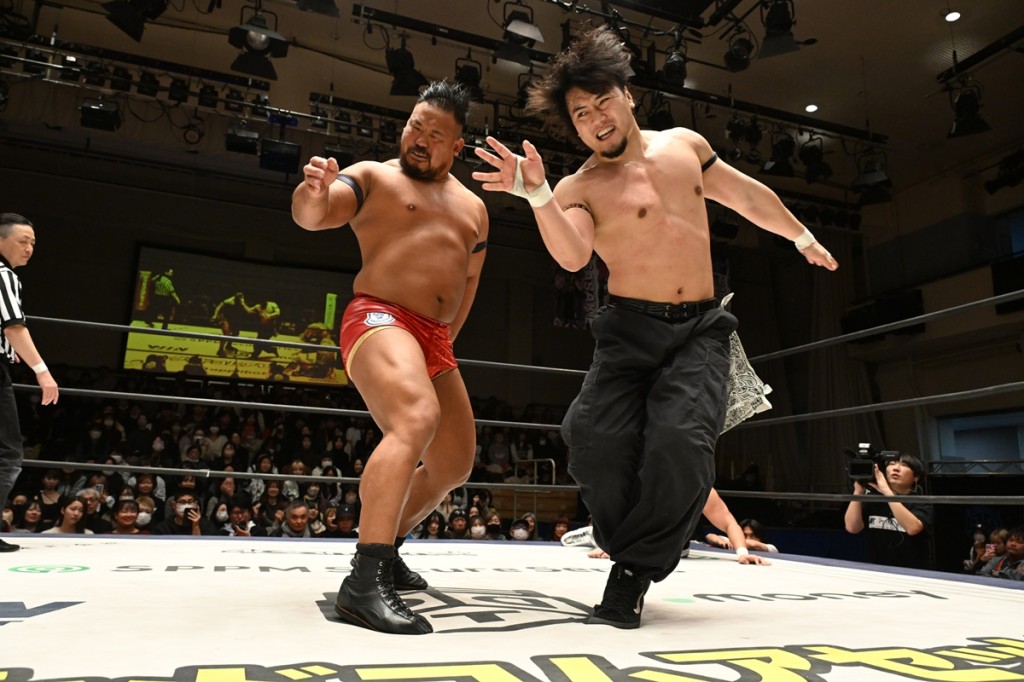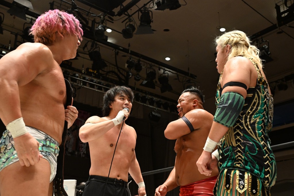 まずは先発したKANONと飯野がショルダータックル合戦、KANONと納谷がエルボー合戦で火花を散らせた。MAOが場外の2人めがけてラ・ケブラーダを発射。飯野がKANONに雪崩式バックフリップ、納谷がダイビング・エルボードロップ、飯野が低空スピアもカット。KANONが飯野をコブラツイストで締め上げれば、MAOが掌底を叩き込んだ。飯野がスピアもKANONが止めてかわした。KANONと飯野がラリアット相打ち。MAOがみちのくドライバーⅡで納谷を排除。飯野が助走なしのスピアを見舞えば、KANONはラリアット。最後はKANONがGURU-GURUドライバーで飯野を仕留めた。