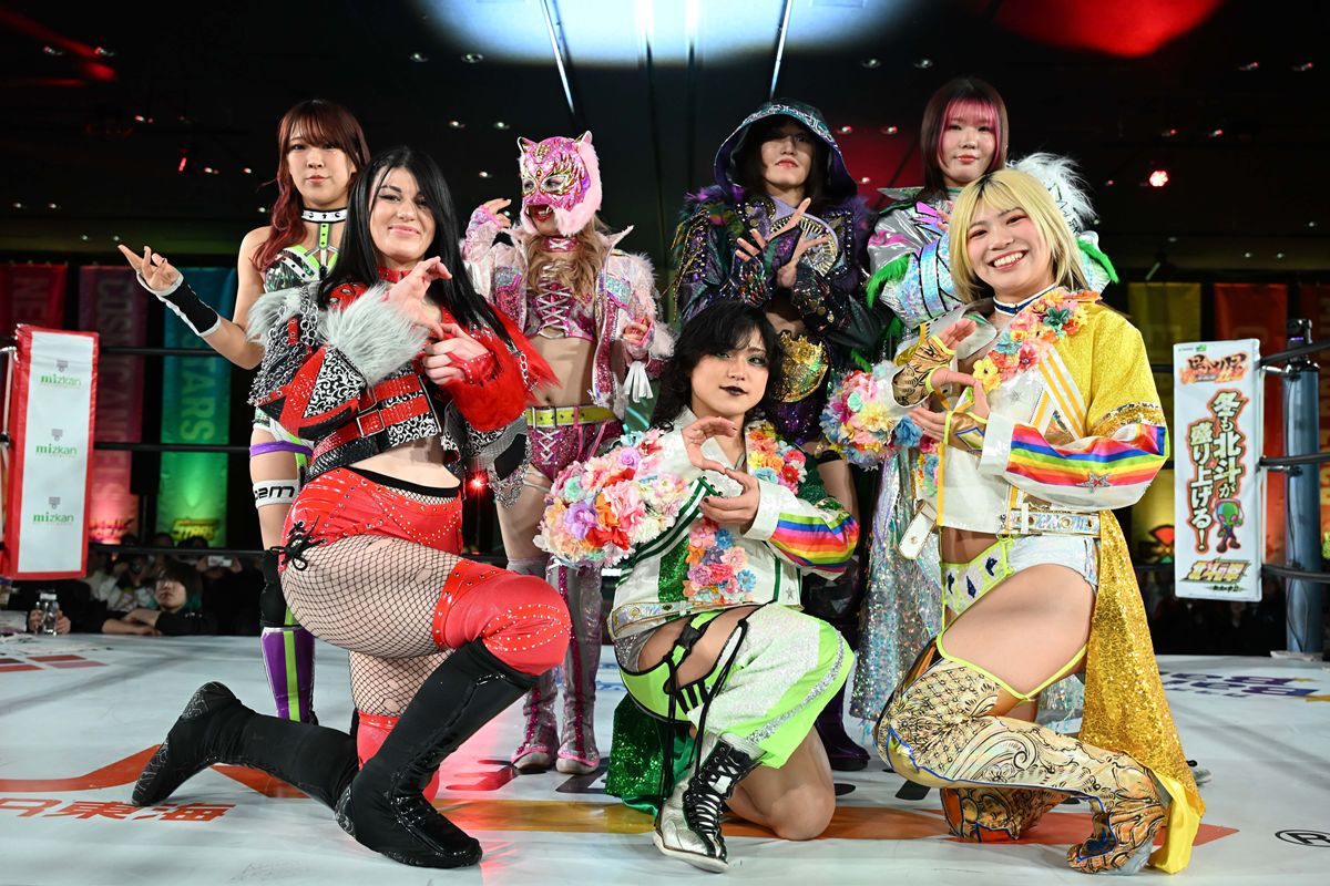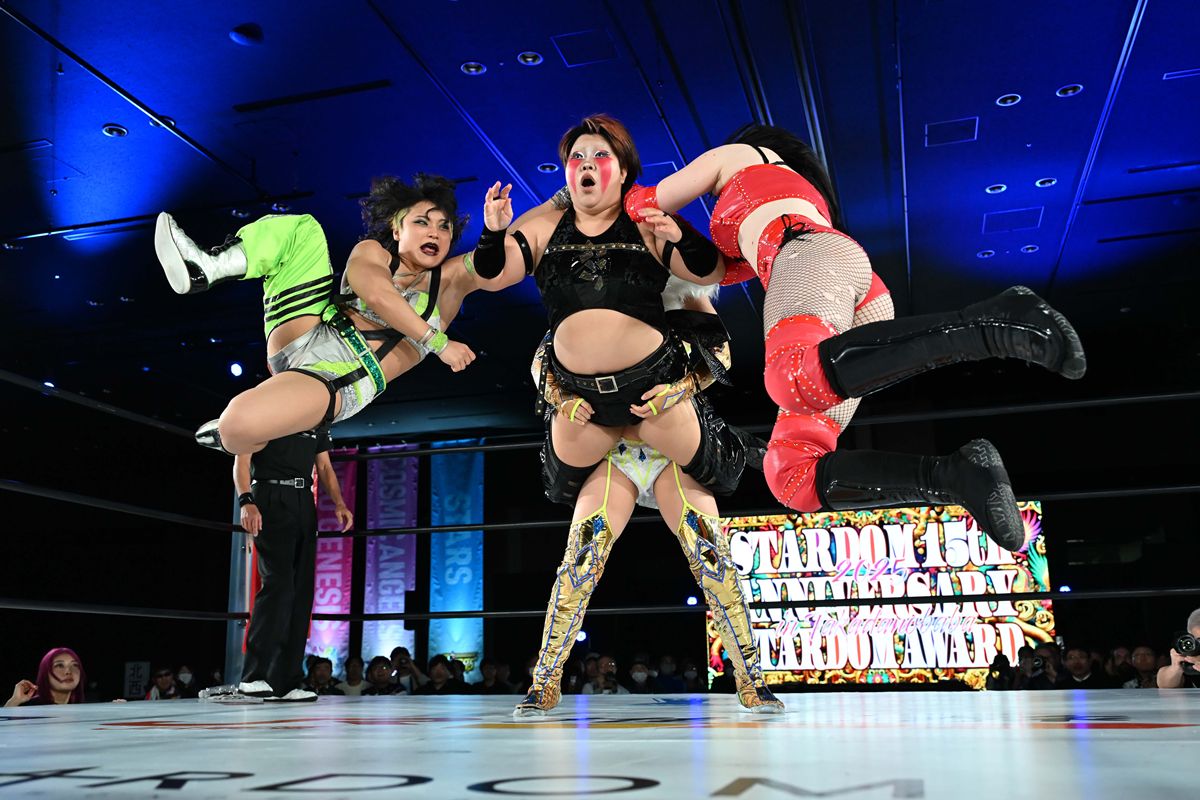 試合は羽南&飯田沙耶&ビー・プレストリー&朱里&壮麗亜美&スターライト・キッド&AZM組と、上谷沙弥&刀羅ナツコ&小波&琉悪夏&吏南&稲葉あずさ&フキゲンです★の「H.A.T.E.」連合軍による激突。前日の初戦に続き、各王座を巡る前哨戦の様相を呈した。
